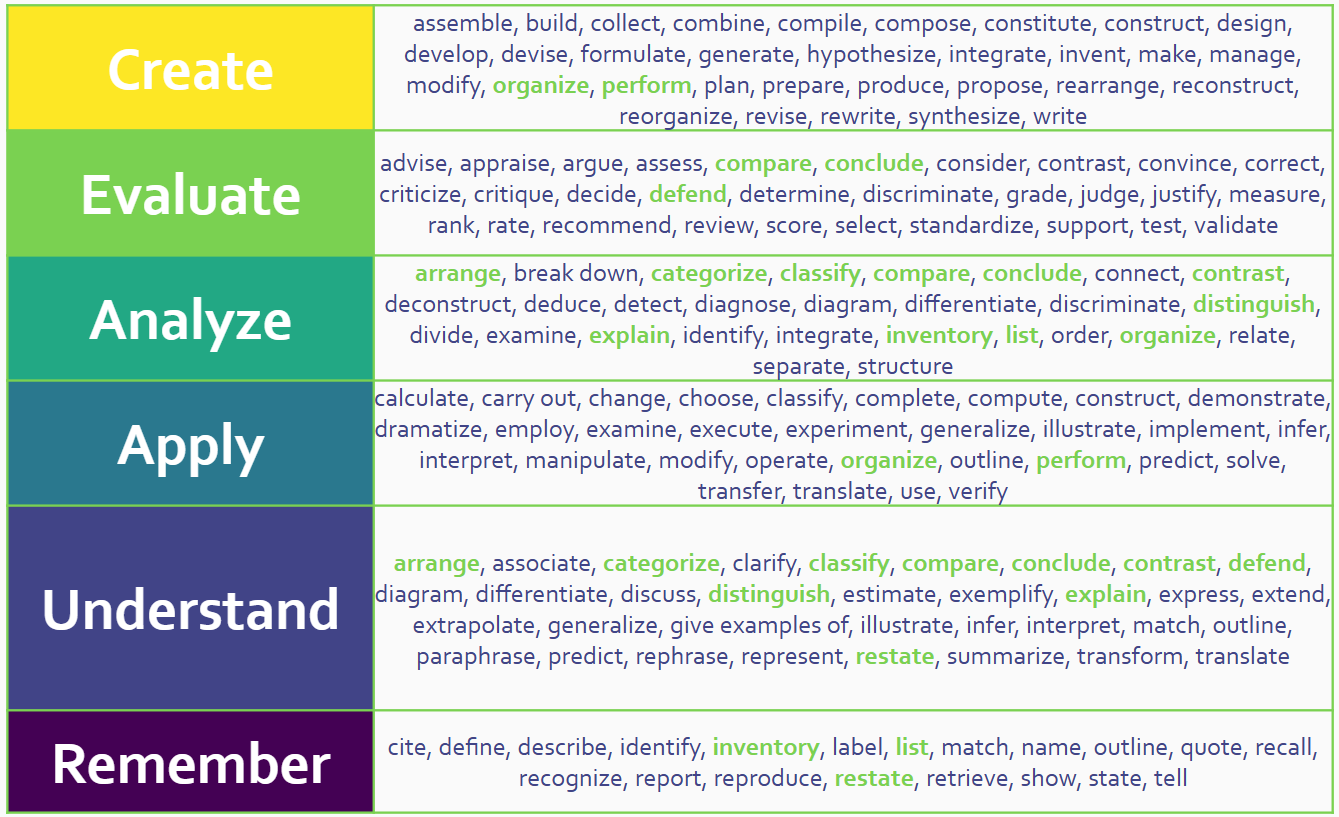 - Describe pedagogical frameworks and methods that support Learning Outcome development (including Bloom’s Taxonomy and the Smartie Principles)