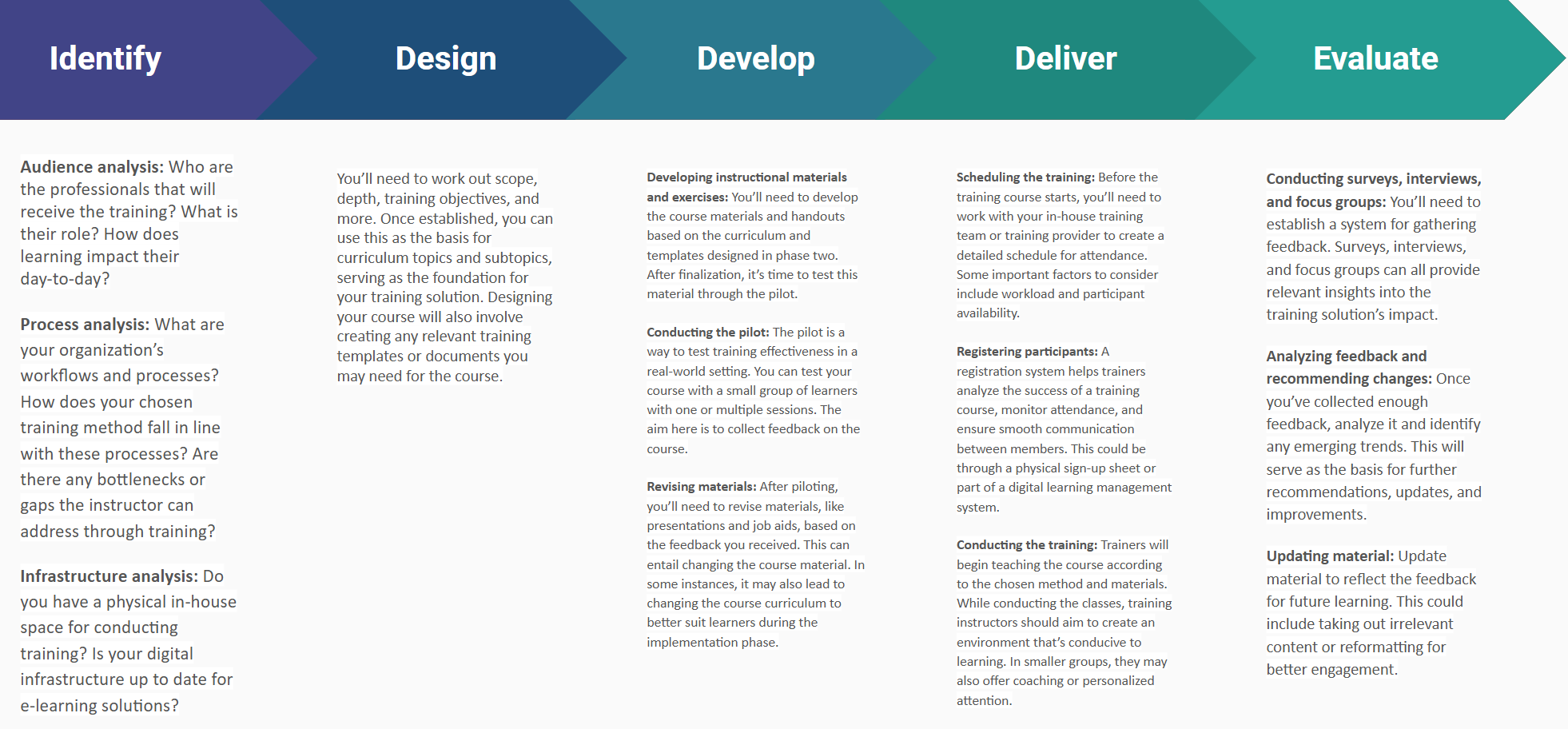 The Training Life Cycle – identify, design, develop, deliver, evaluate: