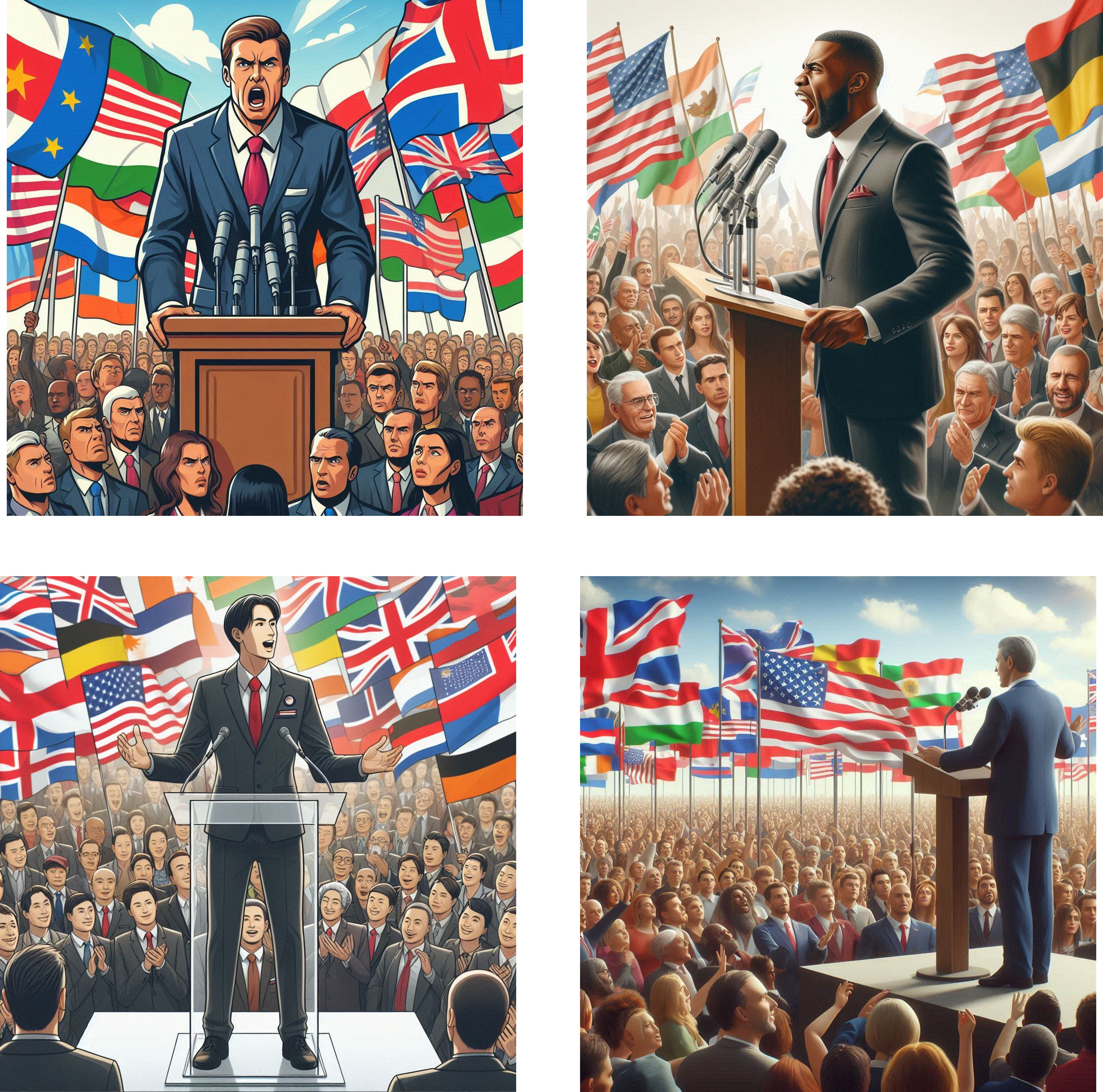 When asked with a very general request “draw a politician” the tool will most likely reproduce societal biases. As you cann see a politician despite of being a agender therm returns in tis majority light skin tone man, in strong quit angry posture. There are a lot of flags around.